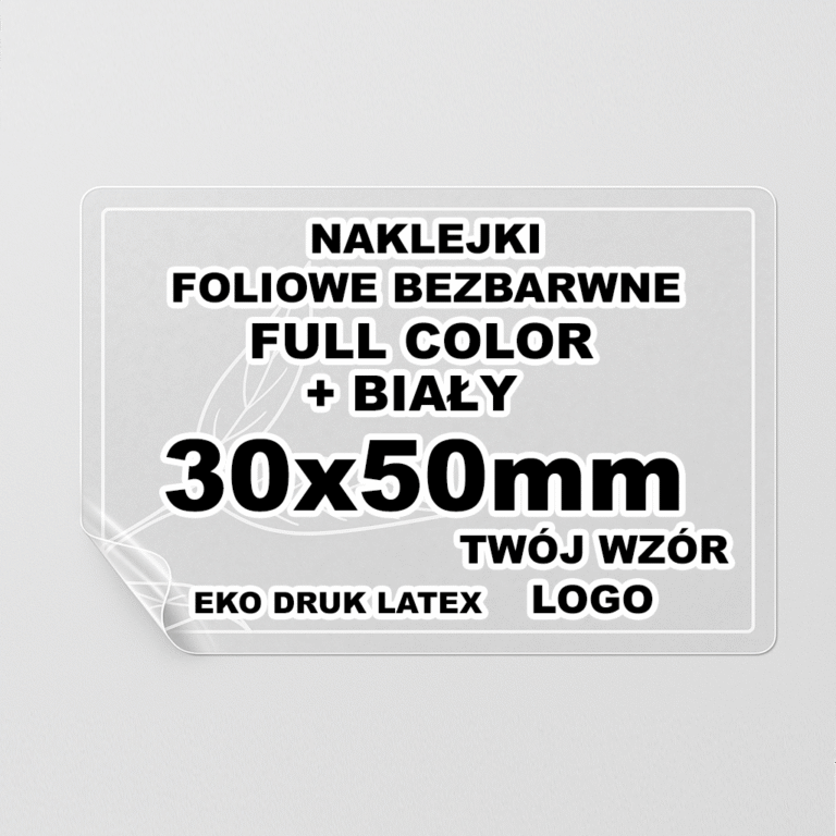 Naklejki Foliowe Bezbarwne – Druk Biały – Twój Wzór – Prostokątna 30x50mm