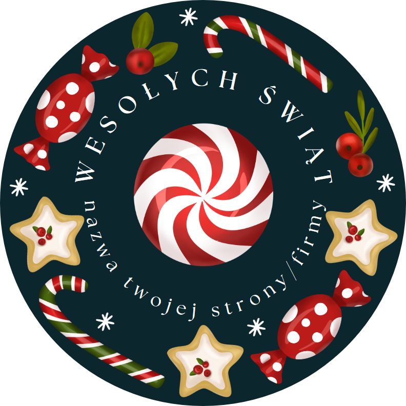 Naklejki personalizowane o średnicy 5 cm (+/- 2 mm). Cena dotyczy kompletu 60 naklejek z nadrukowanym motywem graficznym oraz napisem „WESOŁYCH ŚWIĄT”
